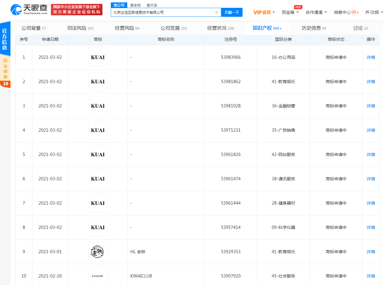 近日,快手关联公司北京达佳互联信息技术有限公司申请注册多个商标,包括“KUAI”、“HI,老铁”,国际分类涉及办公用品,教育娱乐、金融物管、广告销售、网站服务、健身器材等,状态均为“商标申请中”。