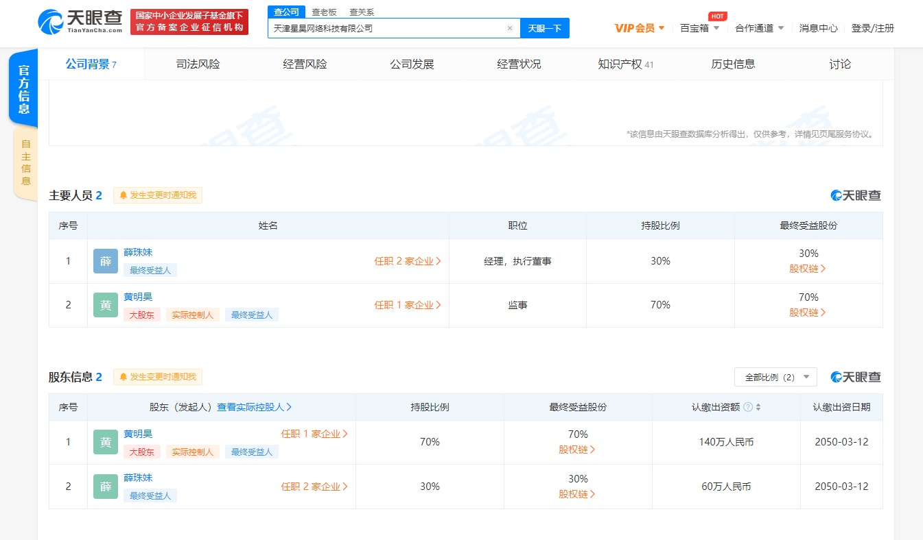 天眼查App显示,黄明昊为该公司最大股东,持股比例70%,同时也是该公司疑似实际控制人。
