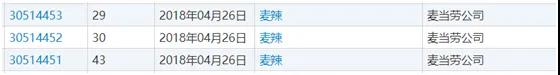 该3枚“麦辣”商标由麦当劳公司于2018年4月26日提出注册申请,用于和食品相关的第29类、30类和43类。