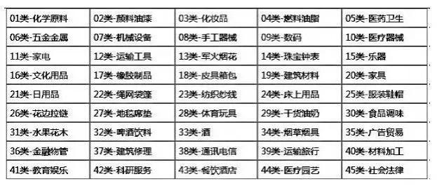 注:尼斯分类是根据《商标注册用商品和服务国际分类尼斯协定》制定的商标类目分类表。尼斯分类每年修订一次,《类似商品和服务区分表》随之予以调整。