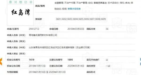 通过国家知识产权局商标局官网查询到,鲁邦公司是在2018年3月2日申请的“红岛湾”商标,初审公告日期为2018年10月13日,注册公告日期为2020年5月14日,专用权期限为2019年1月14日至2029年1月13日,目前该商标是注册状态。