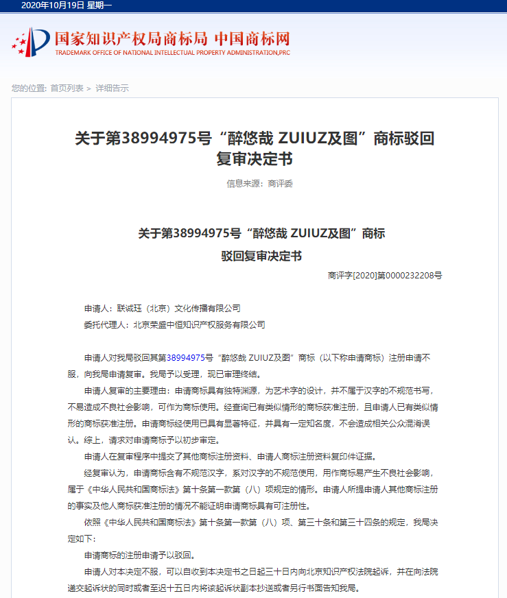 近日,中国商标官网就有一个案例,原本“醉悠哉 ZUIUZ及图”是通过初审并拿到注册证书的,但第二次的艺术字体设计却是因为“含有不规范汉字,系对汉字的不规范使用,用作商标易产生不良社会影响,属于《中华人民共和国商标法》第十条第一款第(八)项规定的情形。”艺术字体的商标未获得注册许可;其实,如果从保护我国的汉字书写文化的角度分析,这种规定和商标评审都是值得推崇的。《商标法》第十条第八款规定:有害于社会主义道德风尚或者其他不良影响的标识,不得作为商标使用。因此,自创的汉字并不符合商标法的规定,建议申请人不要用自创的汉字,但是可以把汉字在艺术表现上进行风格设计,但最好不要过于夸张,否则可能被审查员认定为“不规范汉字”驳回,而这主要的情形有以下几种:1、文字有缺失,仅含有文字本身的一部分,造成不规范使用,易使消费者对其书写造成错误认知,产生不良社会影响的;