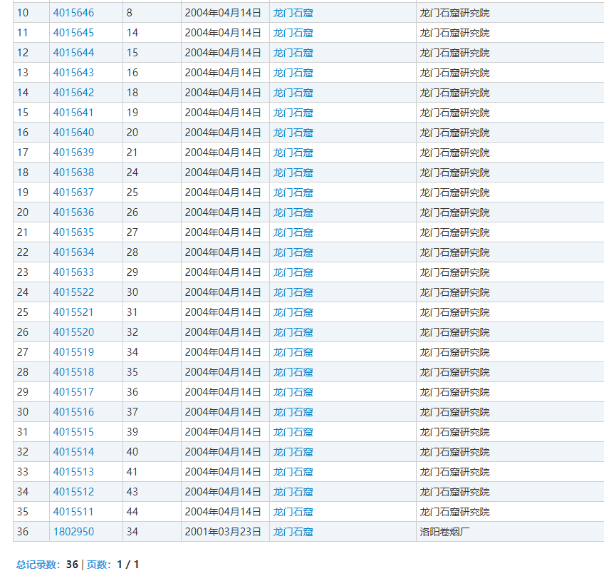 通过国家知识产权局中国商标网查询发现,关于龙门石窟的商标注册信息共36条,其中有34条申请人为龙门石窟研究院。另外两条由企业申请。