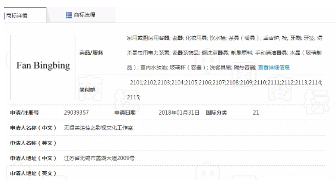 据悉,范冰冰曾想使用自己的名字拼音大小写“FAN BING BING”“fan bing bing”注册申请商标,其中,注册在21类上的第29039357号“Fan Bingbing”商标被国家知识产权局以该商标构成《商标法》第31条所指情形为由,将其指定使用在其余复审商品上的注册申请予以驳回。范冰冰不服此决定,这才起诉了国家知识产权局。