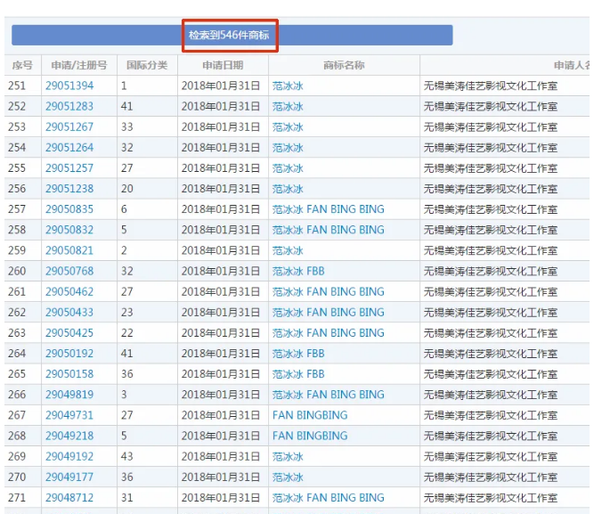据查询,至今为止,无锡美涛佳艺影视文化工作室一共申请了500多个商标,多为范冰冰本人及其弟弟范丞丞的名字所有相似的名称,涵盖多个类别。