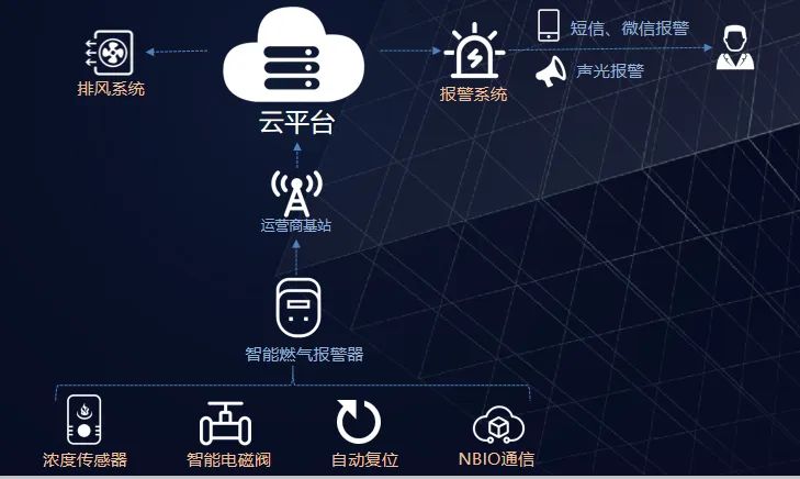 基于物联网平台系统应用技术,在燃气易泄漏的地方安装智能燃气感测终端,内含燃气浓度传感器,一旦检测到燃气泄漏,立即触发电池阀进行关停操作,声光报警和自动启动排风系统,三种措施进行现场危害处理,泄漏信息通过无线网络,传送至云平台,利用手机短信或微信进行远程通知用户。效率的预警措施加上现场应急处理方案,可将燃气泄漏危害降到最低,极大地增强人们用气安全保障。